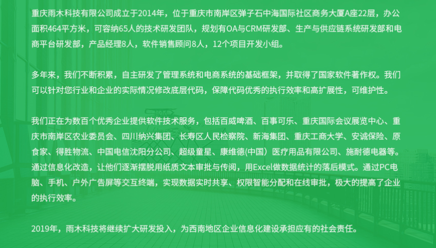 重庆雨木科技有限公司成立于2014年,位于重庆市南岸区弹子石国际社区商务大厦A座22楼。办公面积464平方米,可容纳65人的技术研发团队。规划有OA与CRM研发部、ERP与供应链系统研发部和商城系统研发部,产品经理八人,软件销售顾问八人,12个项目开发小组。